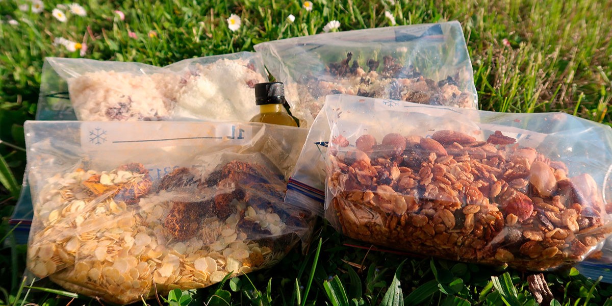 Les déshydratés maison peuvent être extrêmement caloriques et nutritifs, surtout si on mixe céréales, légumineuses et fruits secs. Par exemple :