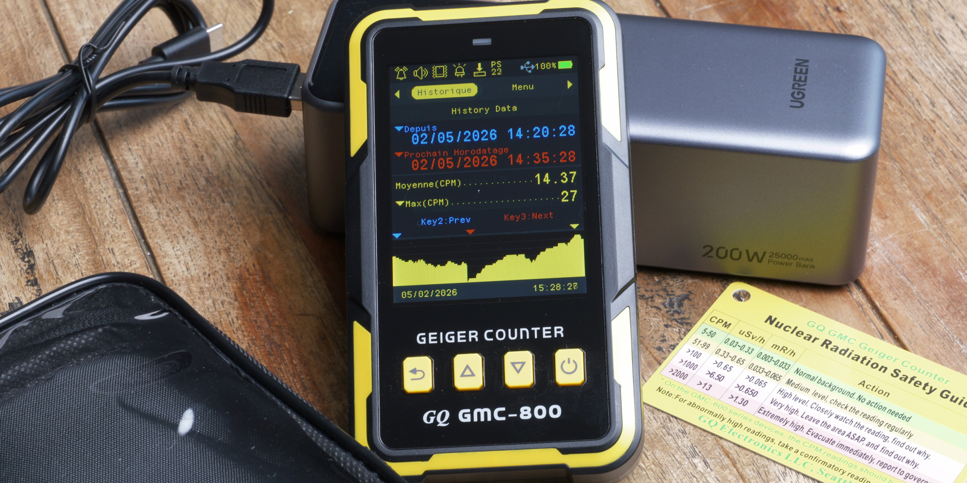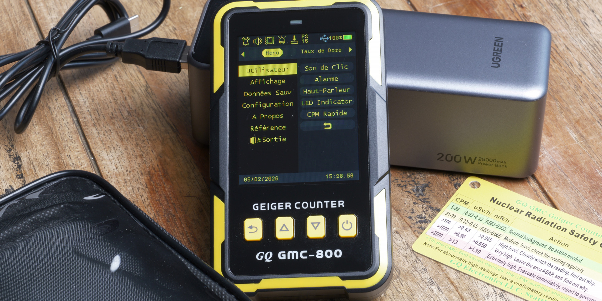 Le GQ GMC‑800, en revanche, combine fiabilité, simplicité et portabilité. Son tube Geiger robuste détecte les rayonnements β, γ et X, son interface claire (et en Français), écran couleur, alarmes sonores et visuelles, journalisation des mesures, permettent de prendre des décisions rapides et informées. Il offre un équilibre pragmatique : Suffisamment précis pour identifier les points chauds et comparer plusieurs zones, mais pas surdimensionné au point de devenir complexe ou fragile à transporter. Les retours utilisateurs confirment sa constance, sa facilité d’usage et sa robustesse, exactement ce dont une personne en situation de mobilité a besoin.