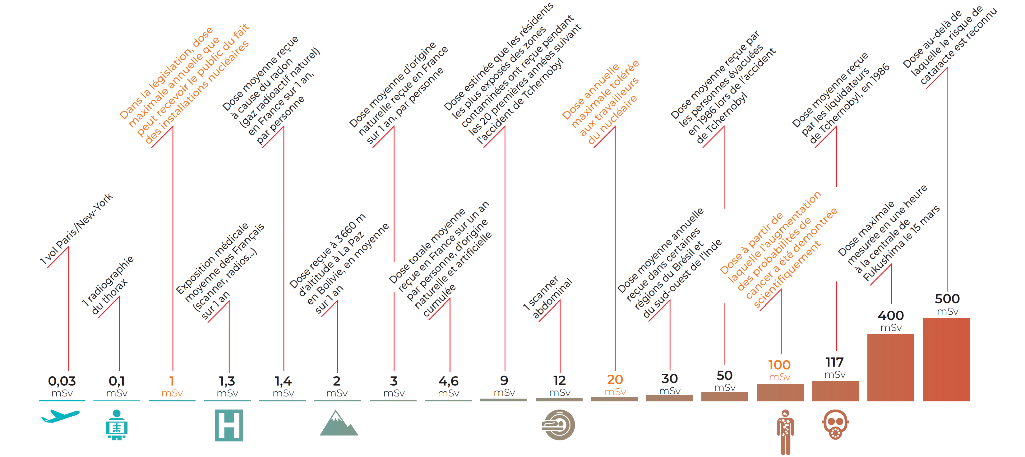 Le compteur Geiger ne mesure pas le danger absolu, il indique seulement le niveau de rayonnement ambiant. Ce qui compte vraiment, c’est le temps passé à ce niveau :