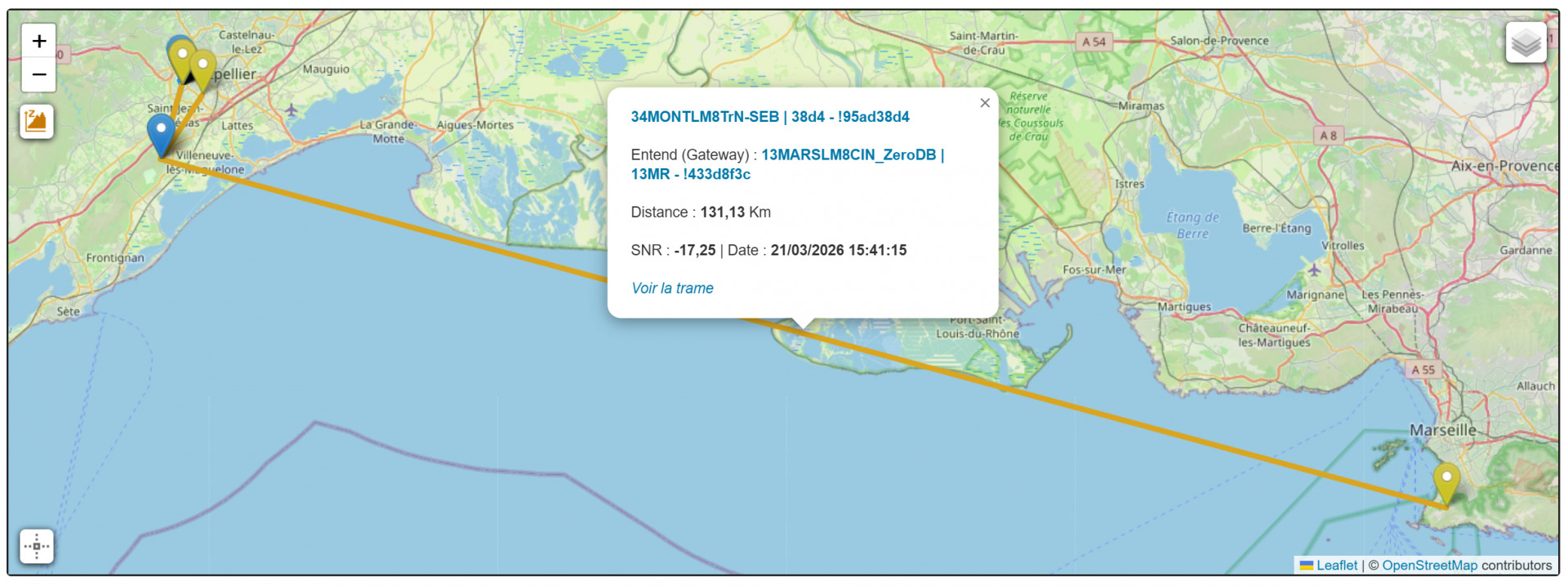 C’est d’ailleurs dans cette logique qu’il devient intéressant. Car derrière cette approche non finalisée se cache un potentiel technique réel. Les performances radio sont particulièrement attractives, avec une puissance d’émission pouvant atteindre 28 dBm, associée à la sensibilité apportée par le front-end KCT8103L RF front-end. Sur le terrain, cela se vérifie concrètement : lors de mes tests avec une antenne de 8dBi, une liaison montante a été établie sur plus de 130 km avec un SNR de -17,25, ce qui reste tout à fait exploitable en LoRa. Ce type de résultat illustre bien la capacité du node à maintenir des communications longue distance dans des conditions réelles, et le place clairement au-dessus d’un bon nombre de nodes en performance radio brute.